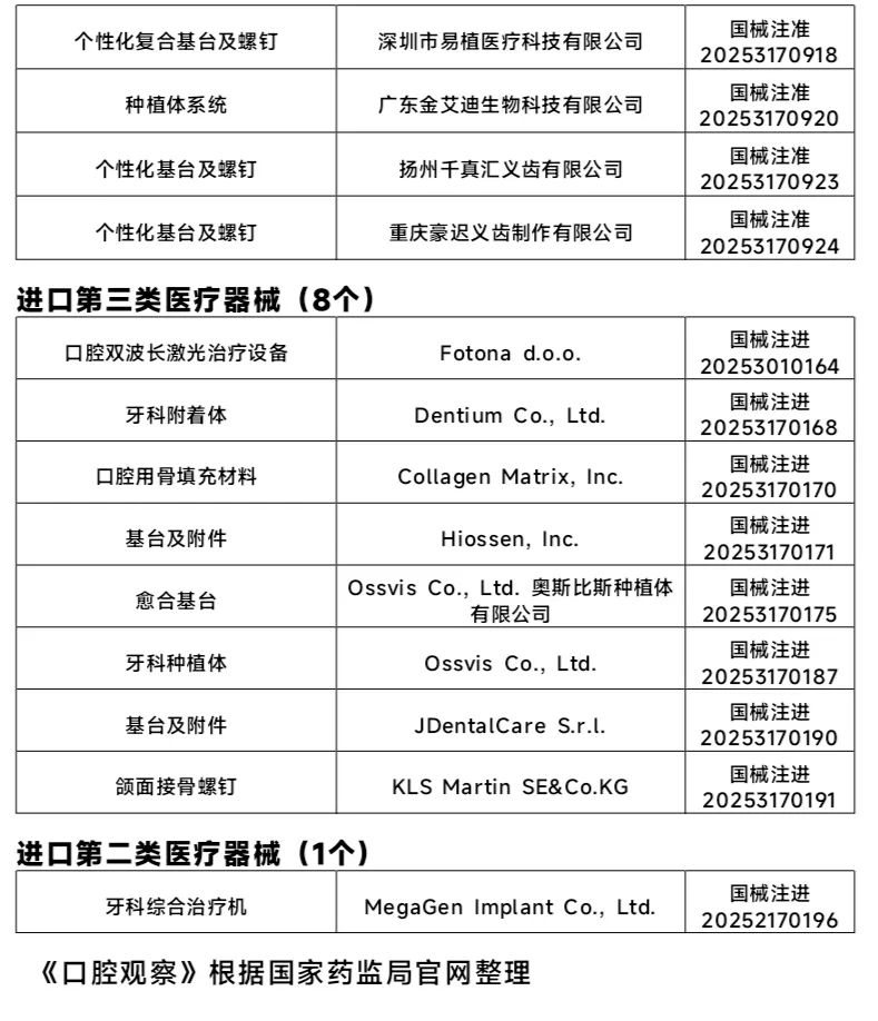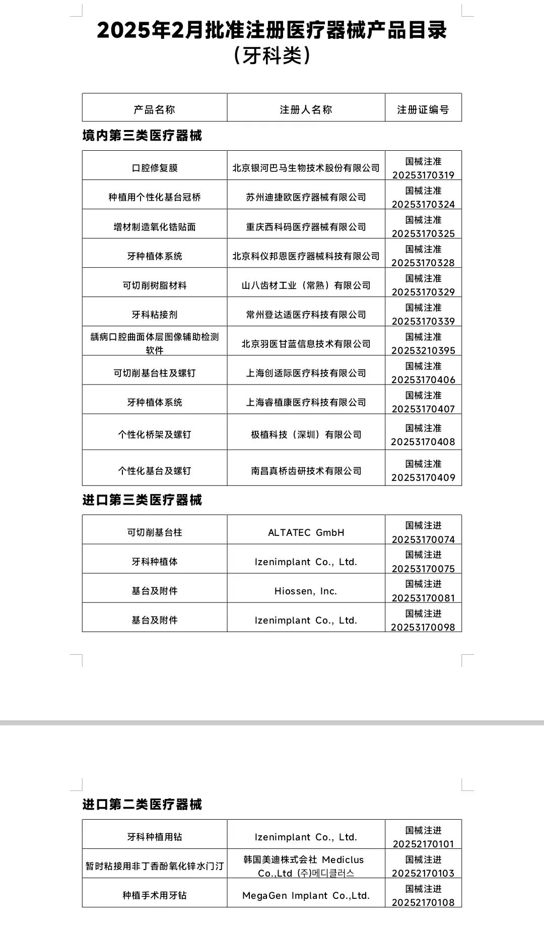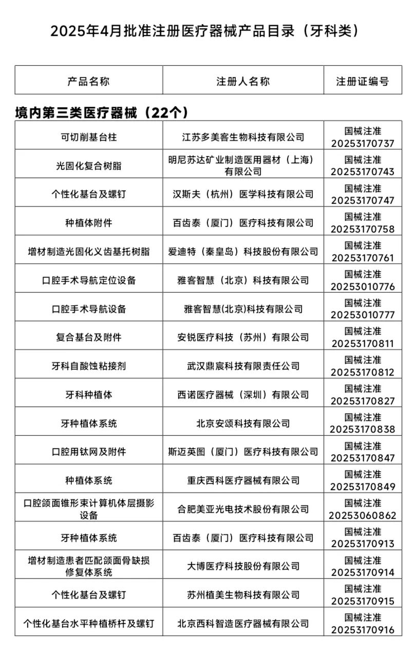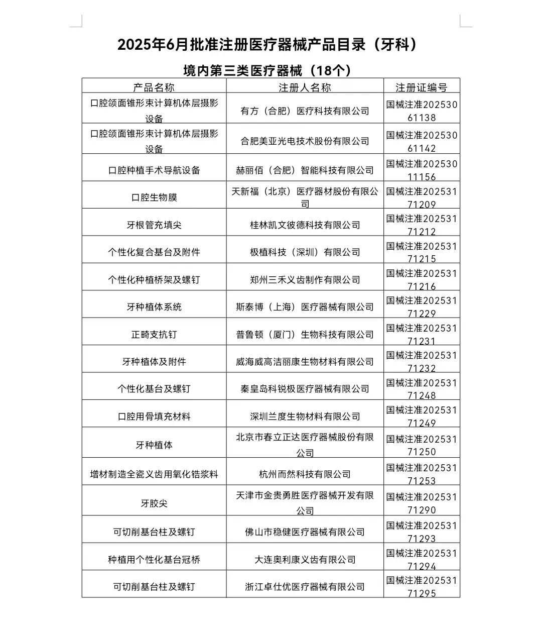 附:2025年(1-6月)批准注册医疗器械产品目录(牙科类)