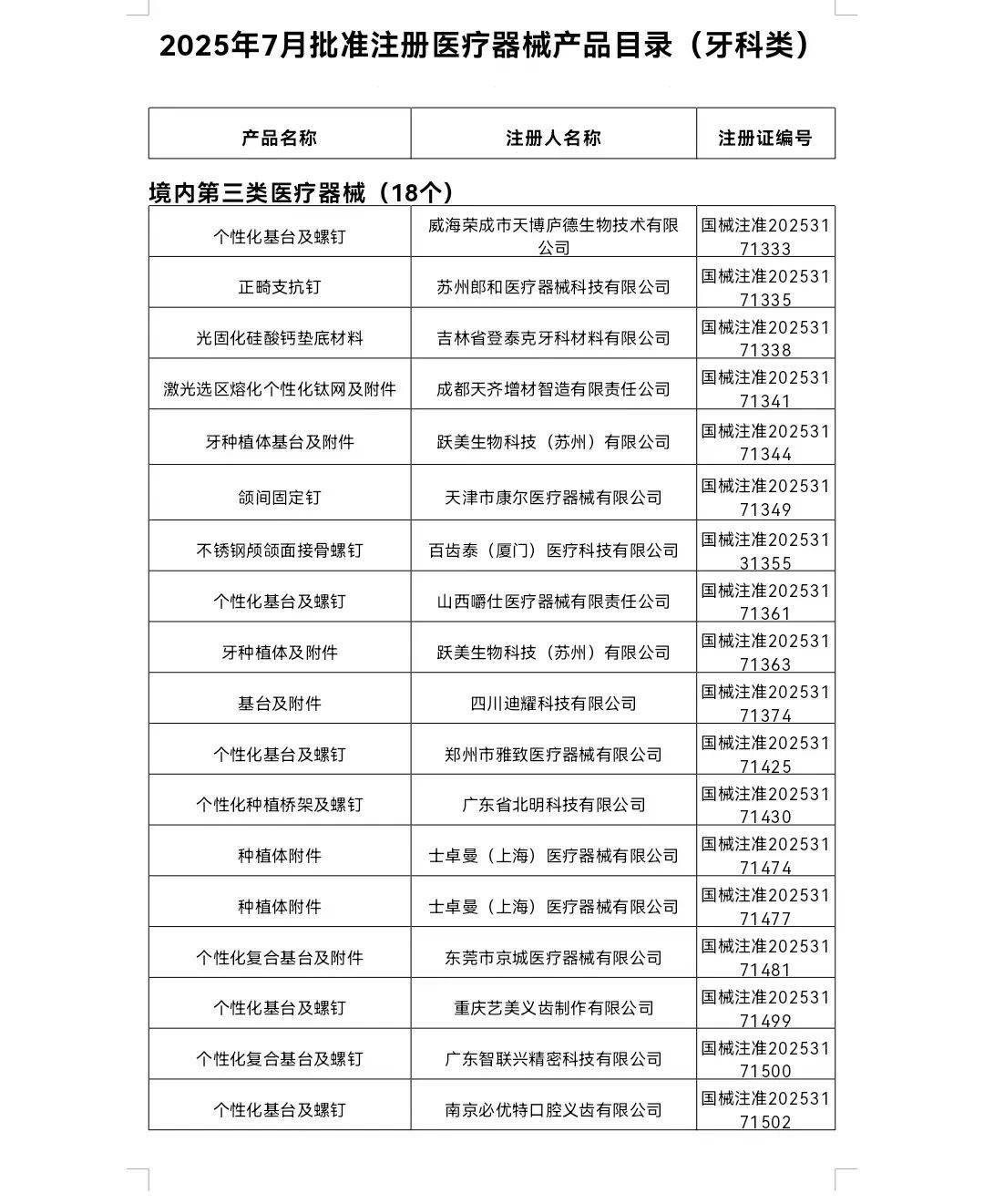 2025年7月,国家药监局共批准注册医疗器械产品295个。口腔观察梳理统计,其中牙科类23个(境内第三类医疗器械产品18个,进口第三类医疗器械产品1个,进口第二类医疗器械产品4个)。