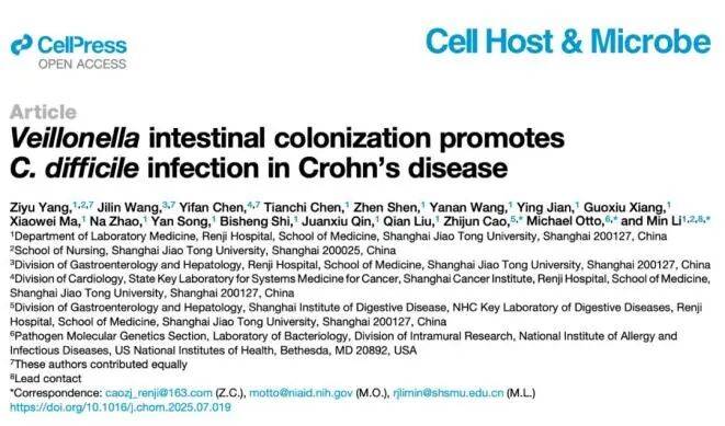 近日,上海交通大学医学院附属仁济医院李敏教授、曹芝君主任医师等在 Cell 子刊 Cell Host & Microbe 上发表了题为:Veillonella intestinal colonization promotes C. difficile infection in Crohn’s disease 的研究论文。