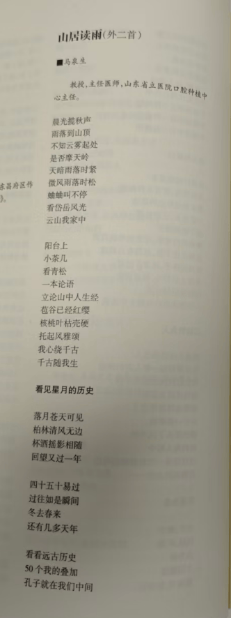 (作者简介:马泉生,教授,主任医师、山东第一医科大学省立医院口腔种植科原主任、我国知名口腔种植专家,早年毕业于四川大学华西口腔医学院;中国大众文化学会口腔文化专委会专家库专家,写诗数百首。)