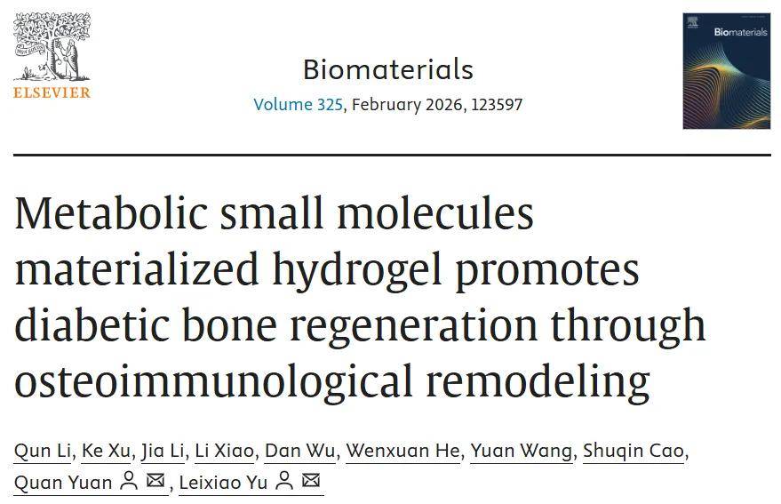 近日,四川大学华西口腔医院袁泉教授、余雷晓研究员在 《生物材料》(Biomaterials)杂志上发表了题为“代谢小分子物质化的水凝胶通过骨免疫重塑促进糖尿病骨再生 Metabolic small molecules materialized hydrogel promotes diabetic bone regeneration through osteoimmunological remodeling”的研究成果。