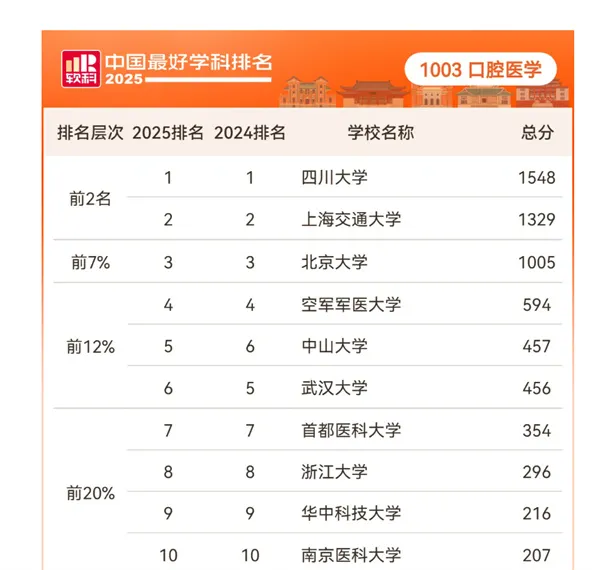 2025年10月15日,高等教育专业评价机构软科正式发布“2025软科中国最好学科排名”,排名榜单包括98个一级学科和5个专业学位类别,共有517所高校的5344个学科点上榜。四川大学口腔医学获1548分,连续八年位列口腔医学全国第一。