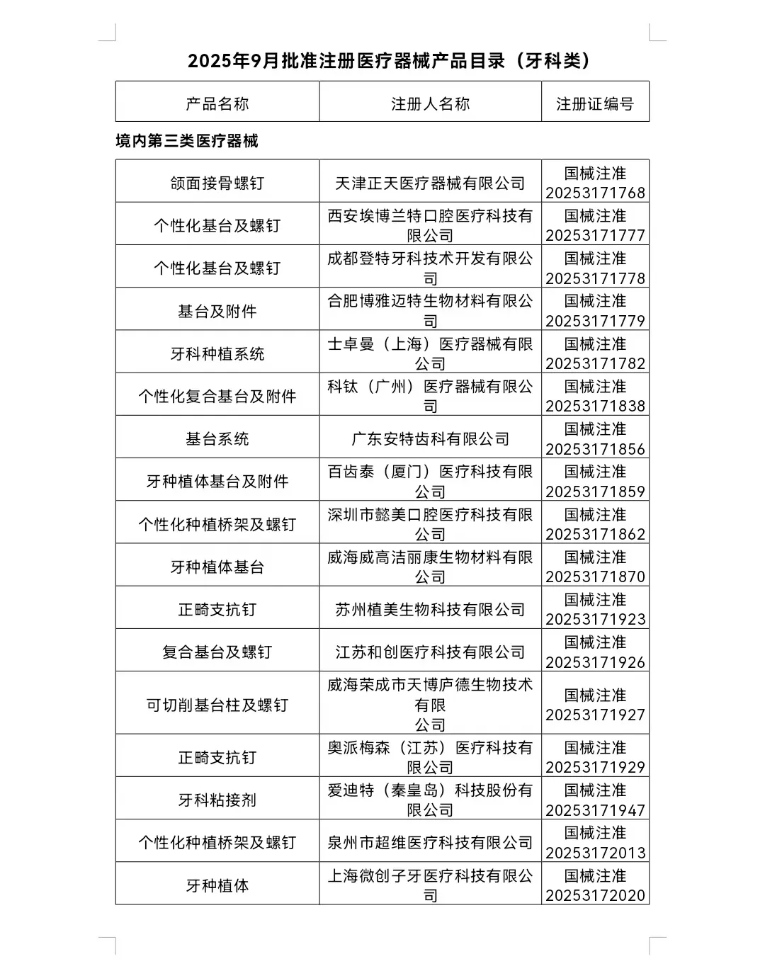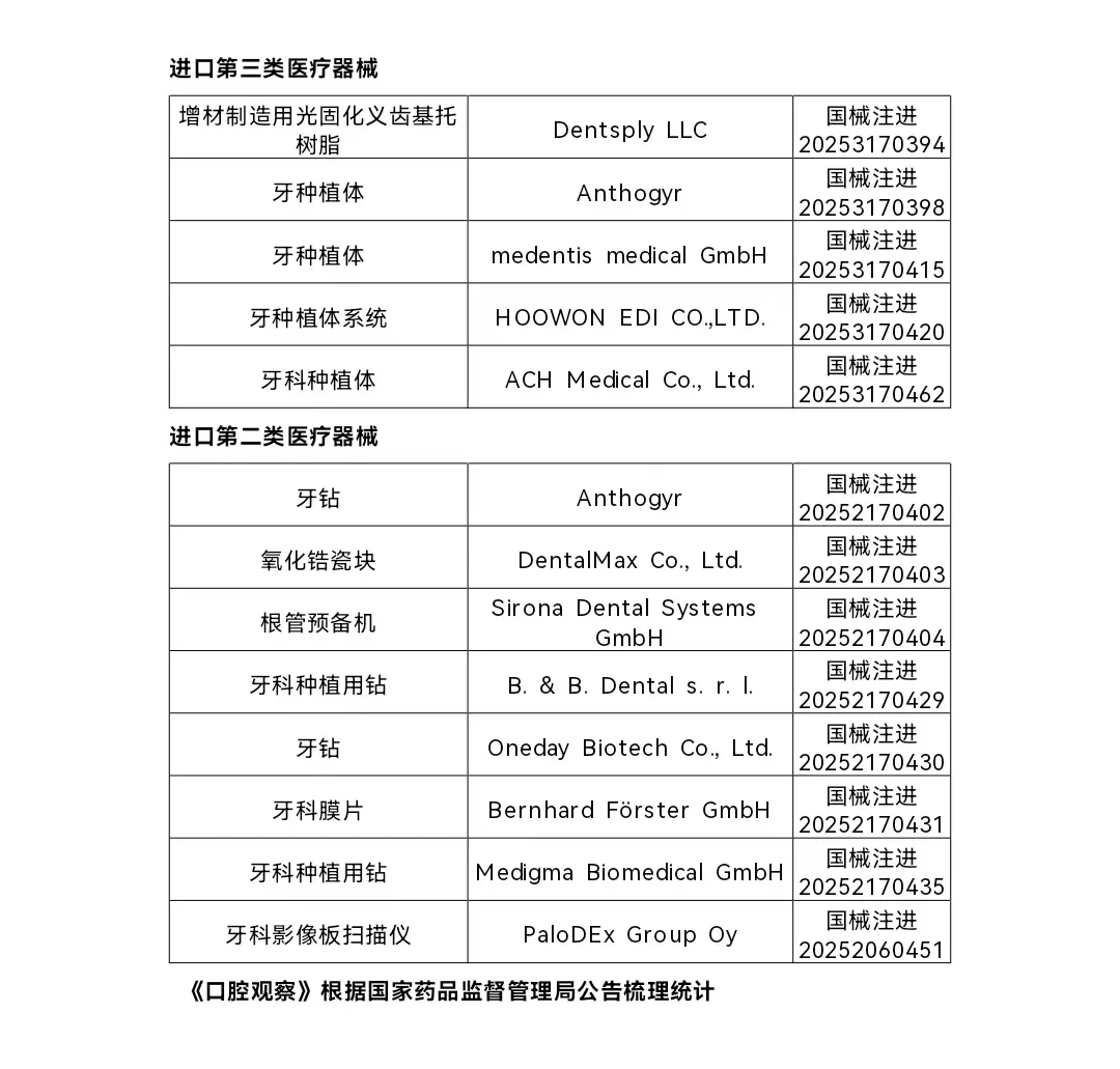 2025年9月,国家药监局共批准注册医疗器械产品348个。其中,牙科类30个(境内第三类医疗器械产品17个,进口第三类医疗器械产品5个, 进口第二类医疗器械产品8个。)