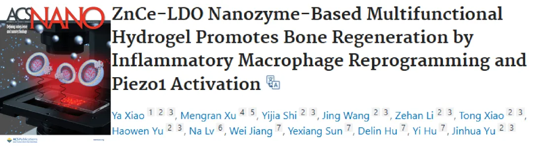 近日,南京医科大学口腔医学院于金华教授团队在期刊 《纳米》(ACS Nano)杂志上发表了题为 “基于ZnCe-LDO纳米酶的多功能水凝胶通过炎症巨噬细胞重编程和Piezo1激活促进骨再生(ZnCe-LDO Nanozyme-Based Multifunctional Hydrogel Promotes Bone Regeneration by Inflammatory Macrophage Reprogramming and Piezo1 Activation)” 的文章。该研究构建了一种结合锌/铈层状双氧化物纳米酶(ZnCe-LDO)与Piezo1通道激活剂Yoda1的光固化GelMA多功能水凝胶,通过重编程炎症巨噬细胞、缓释Zn/Ce离子及模拟力学信号,实现了免疫调控与成骨/成血管的协同促进。在大鼠颅骨缺损模型中,该水凝胶显著改善了炎症微环境并促进骨再生,为炎症相关骨缺损的精准治疗提供了新策略。据今日口腔& 江苏省口腔疾病研究重点实验室