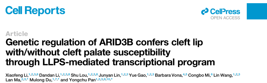 2025年9月,南京医科大学潘永初教授及团队在非综合征型唇腭裂(nsCL/P)遗传调控机制研究领域取得重要进展。相关研究成果以“ARID3B 的遗传调控通过液-液相分离介导的转录程序赋予唇裂伴或不伴腭裂的易感性(Genetic regulation of ARID3B confers cleft lip with/without cleft palate susceptibility through LLPS-mediated transcriptional program)”为题发表于《细胞报告》(Cell Reports)杂志上。该研究不仅鉴定了一系列唇腭裂风险基因,破译了ARID3B基因座导致唇腭裂的分子遗传密码,更发现了相分离介导的转录激活在发育性疾病中的关键作用。