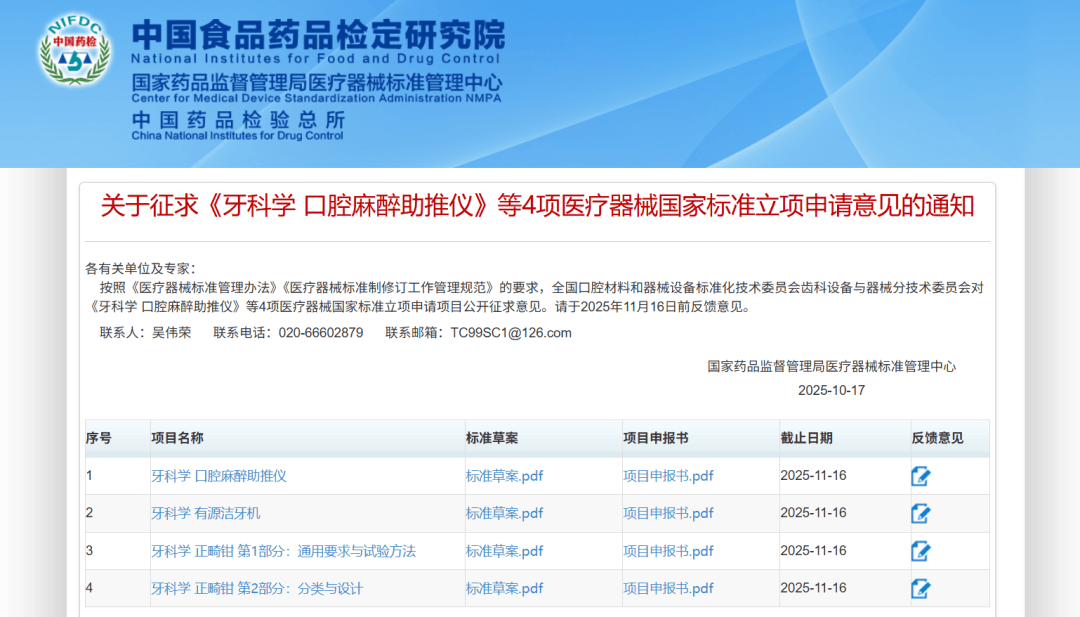 日前,国家药品监督管理局医疗器械标准管理中心发布通知,就《牙科学 口腔麻醉助推仪》等四项医疗器械国家标准立项申请项目公开征求意见,意见反馈截止日期为2025年11月16日。