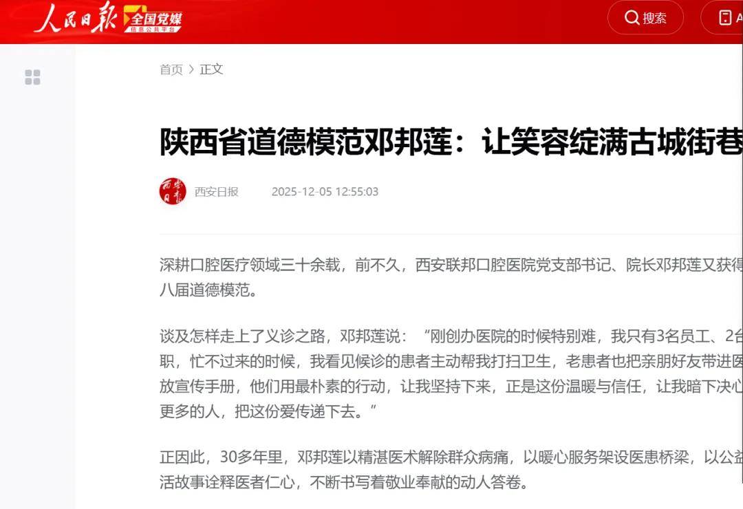 由陕西省委宣传部(省委精神文明建设办公室)、省人力资源和社会保障厅、省总工会、团省委、省妇联5部门评选的“陕西省第八届道德模范”称号于11月28日揭晓,西安联邦口腔医院邓邦莲博士荣耀入选获此殊荣。西安新闻网、西安日报以《陕西省道德模范邓邦莲:让笑容绽满古城街巷》刊发其创业及公益事迹。