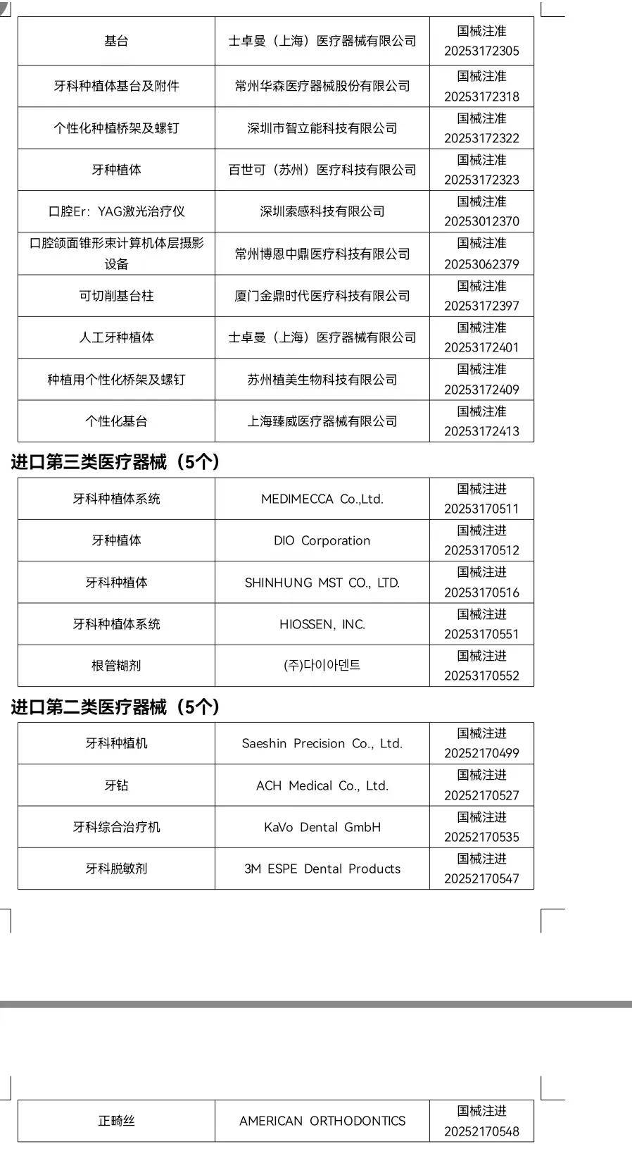 国家药监局发布公告,2025年11月份国家药监局共批准注册医疗器械产品305个。《口腔观察》梳理统计,其中牙科类一共35个(境内第三类医疗器械25个,进口第三类医疗器械5个,进口第二类医疗器械5个)。