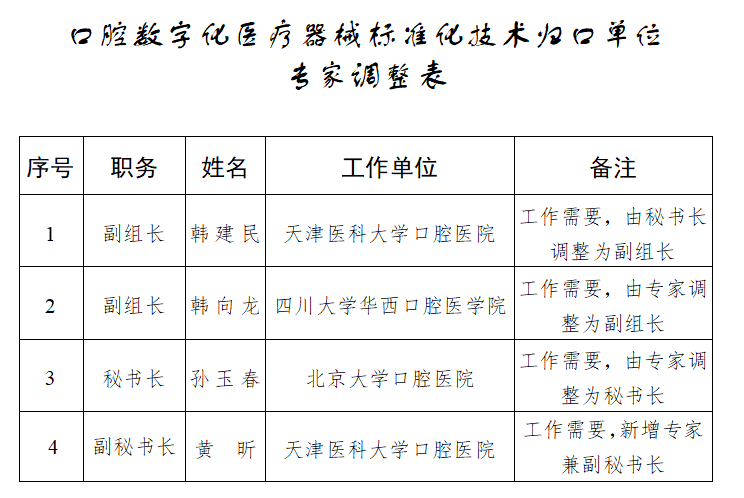| 口腔数字化医疗器械标准化技术归口单位专家调整