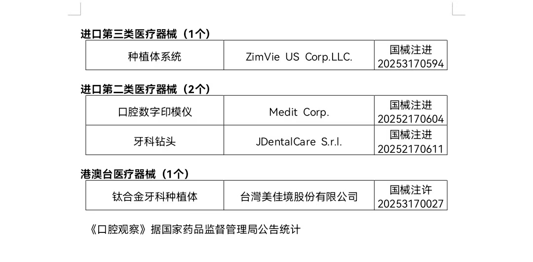 2025年12月,国家药监局共批准注册医疗器械产品388个,《口腔观察》梳理统计,其中牙科类一共27个(境内第三类医疗器械17个);进口第三类医疗器械1个;进口第二类医疗器械2个;港澳台医疗器械1个)。