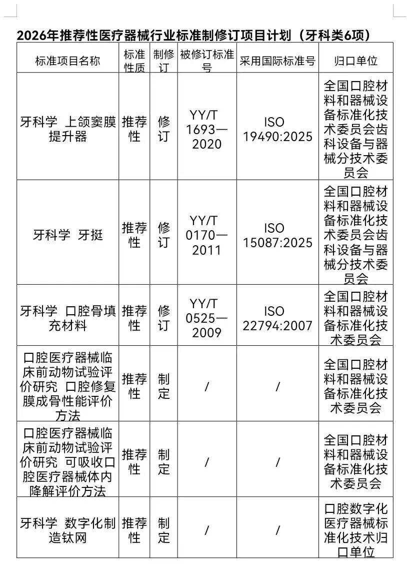 | 国家药监局公示2026年医疗器械行业标准制修订计划项目,涉及牙科类7项