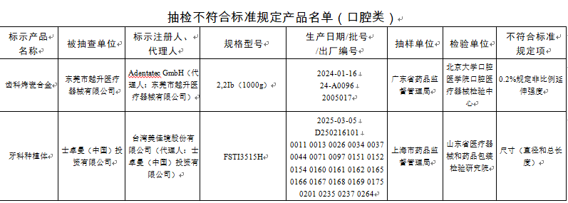 1月27日,国家药监局发布国家医疗器械监督抽检结果通告,为加强医疗器械监督管理,保障医疗器械产品质量安全有效,国家药品监督管理局组织对半导体激光治疗机、口腔固定和活动修复用金属材料等10个品种进行了产品质量监督抽检,有15批(台)产品不符合标准规定。其中涉及口腔类两项:(1)口腔固定和活动修复用金属材料1批:Adentatec GmbH生产,涉及0.2%规定非比例延伸强度不符合标准规定。(2)钛及钛合金牙种植体1批:台湾美佳境股份有限公司生产,涉及尺寸(直径和总长度)不符合标准规定。