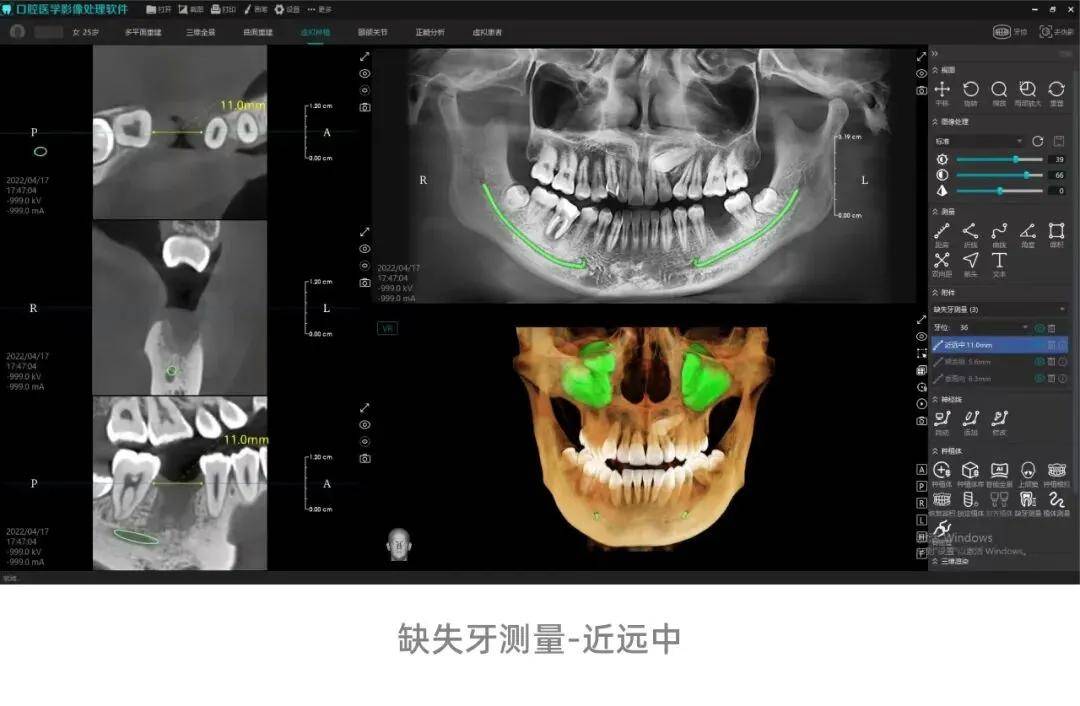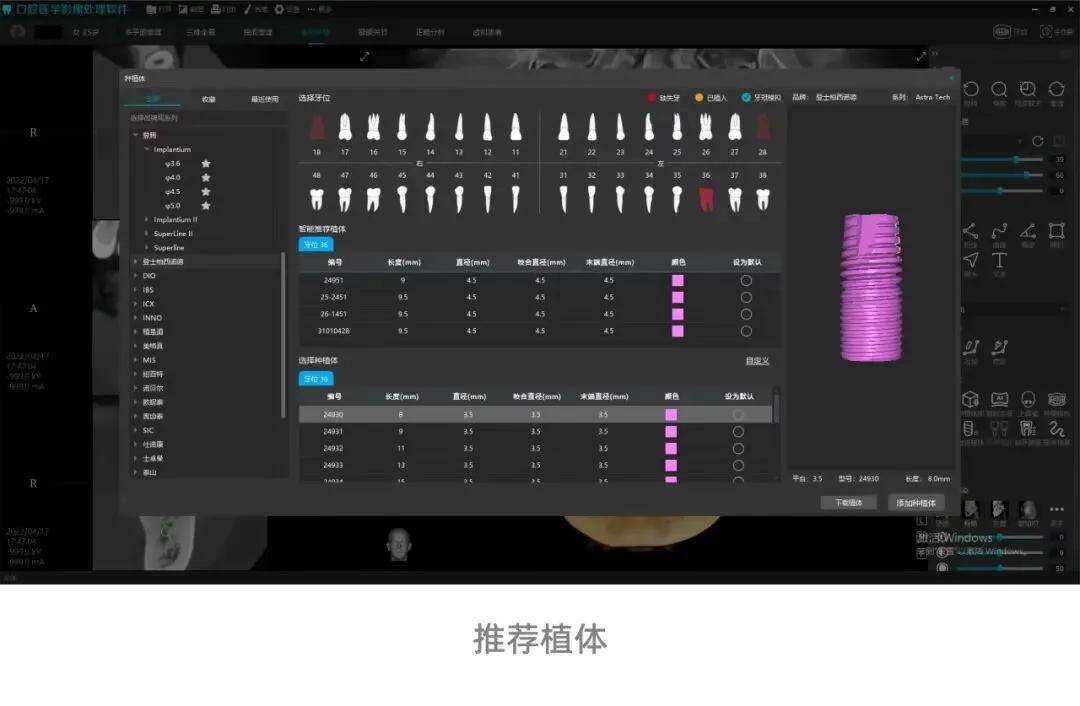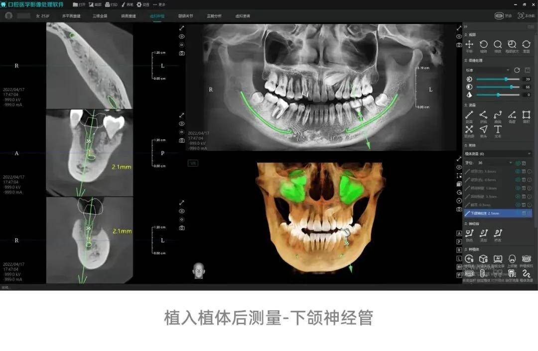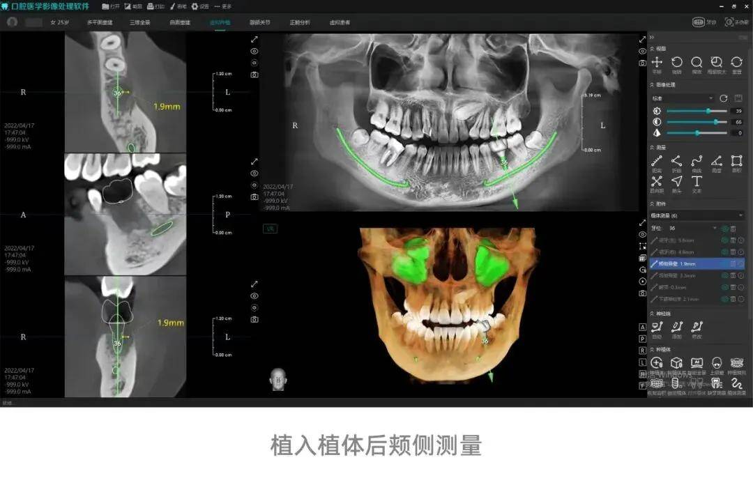 (2)智能种植功能持续迭代,新增缺失牙自动测量、植体智能推荐、植体自动测量功能,构建“自动测量-智能推荐-精准测算”全流程数字化种植辅助体系,提升种植安全性与便捷度。