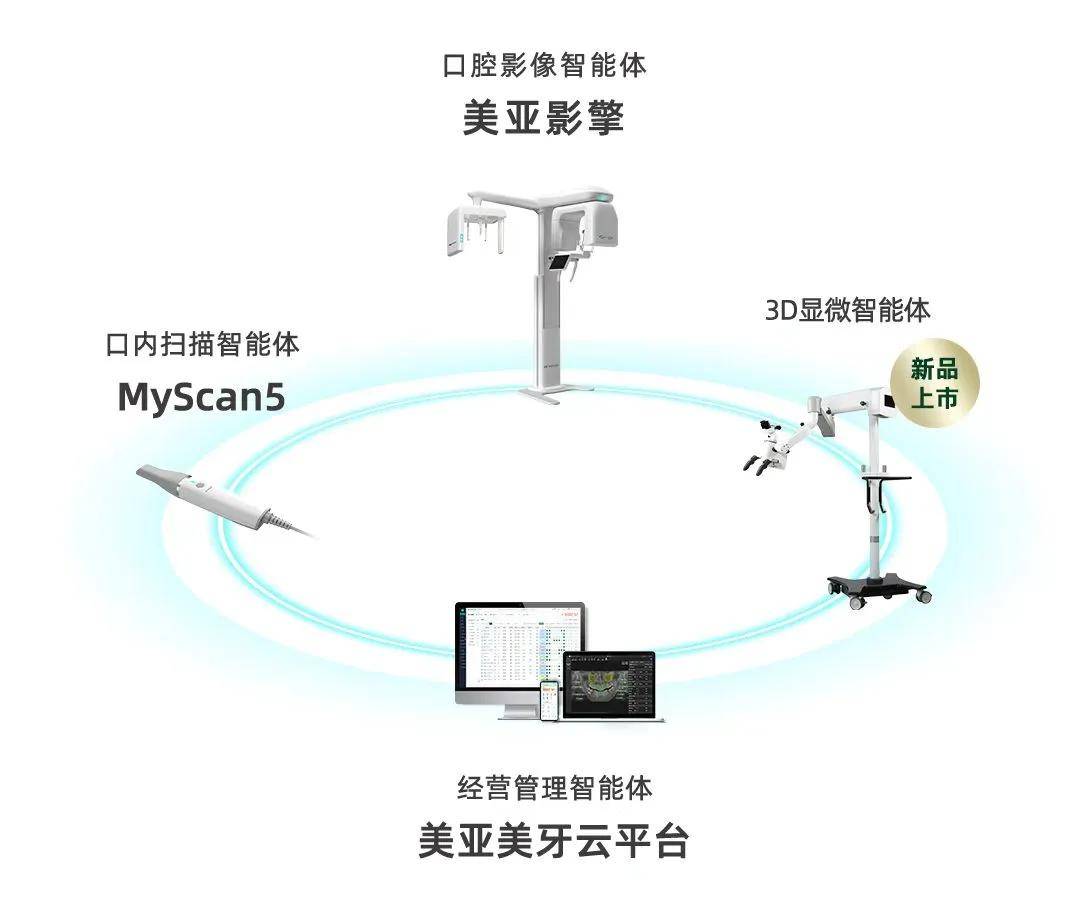 如果说此番亮相的3D显微智能体的补充与美亚影擎的升级,进一步强化了美亚口腔医疗智能体矩阵的全场景覆盖能力,则作为搭配另外两大关键产品,让“硬件+软件+生态”的一体化布局更加完善。这包括口内扫描智能体——MyScan5和经营管理智能体。